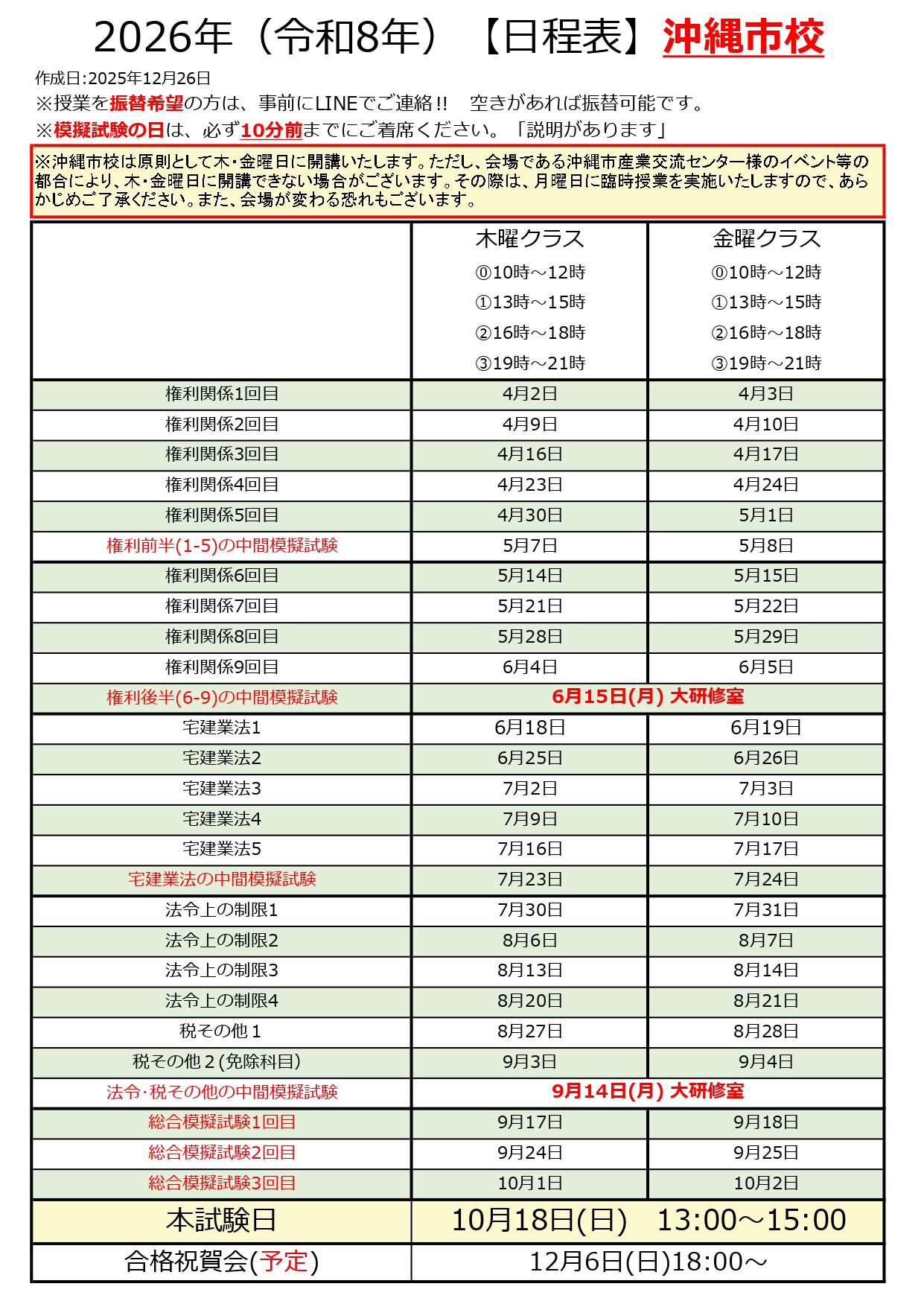 沖縄宅建スクールは、毎週火曜日から日曜日まで、1週間に6回の授業曜日を設定していて、授業に空席があれば振替できる仕組みとなっています。席に余裕があれば、沖縄市・那覇市のどちらでも振替可能です。
