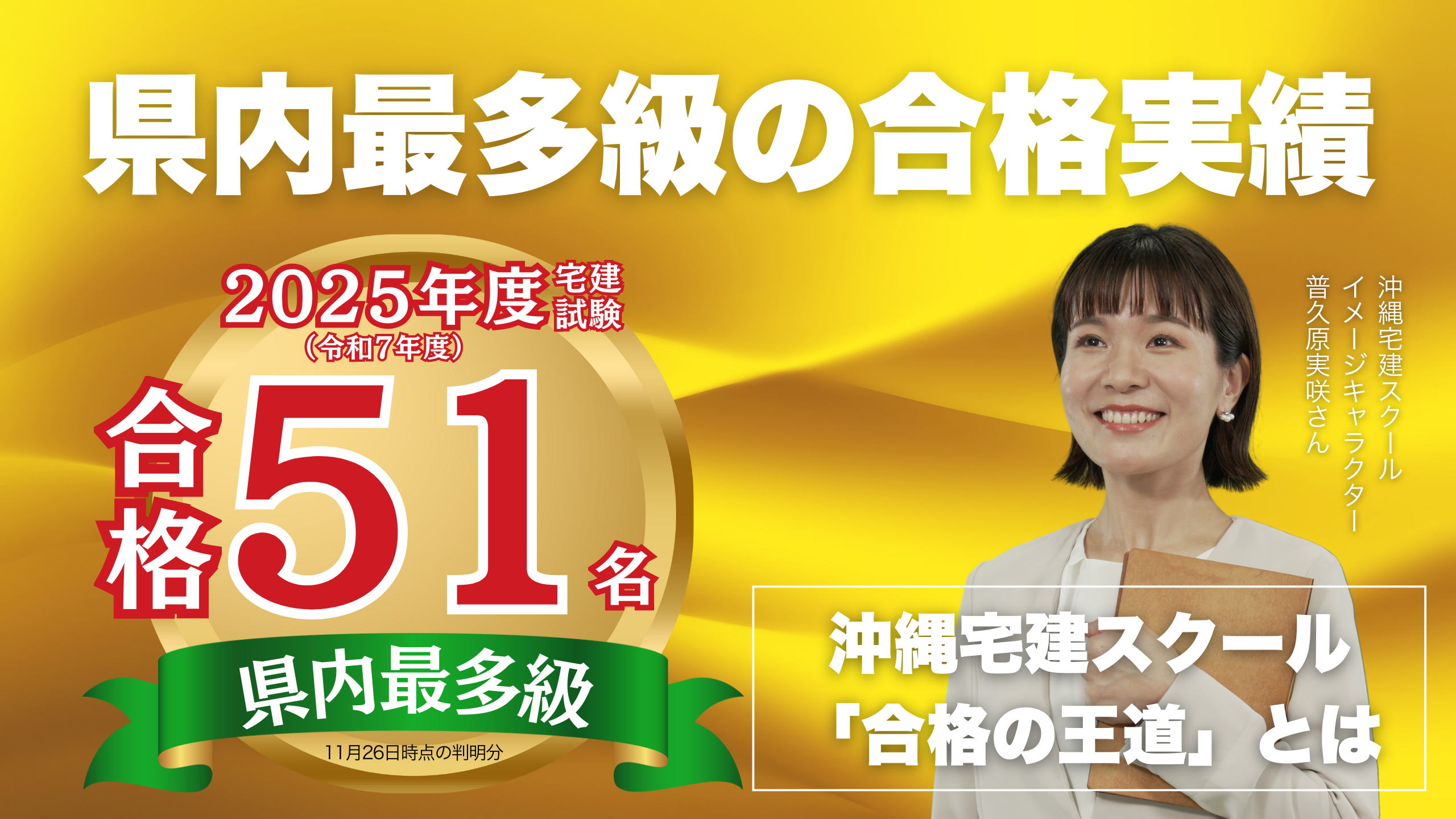 【速報】2025年宅建試験の合格者数を公開しました。 2025年11月30日 最終更新日時 : 2025年11月30日 t-mekaru@merco.jp 沖縄宅建スクール2025年合格者 51名 沖縄宅建スクールは、2025年(令和7年)の宅建試験で51名の合格者を輩出しました(11月26日時点の判明分)。 人生を変える「合格の王道」- 沖縄宅建スクール - 無料説明会に参加する