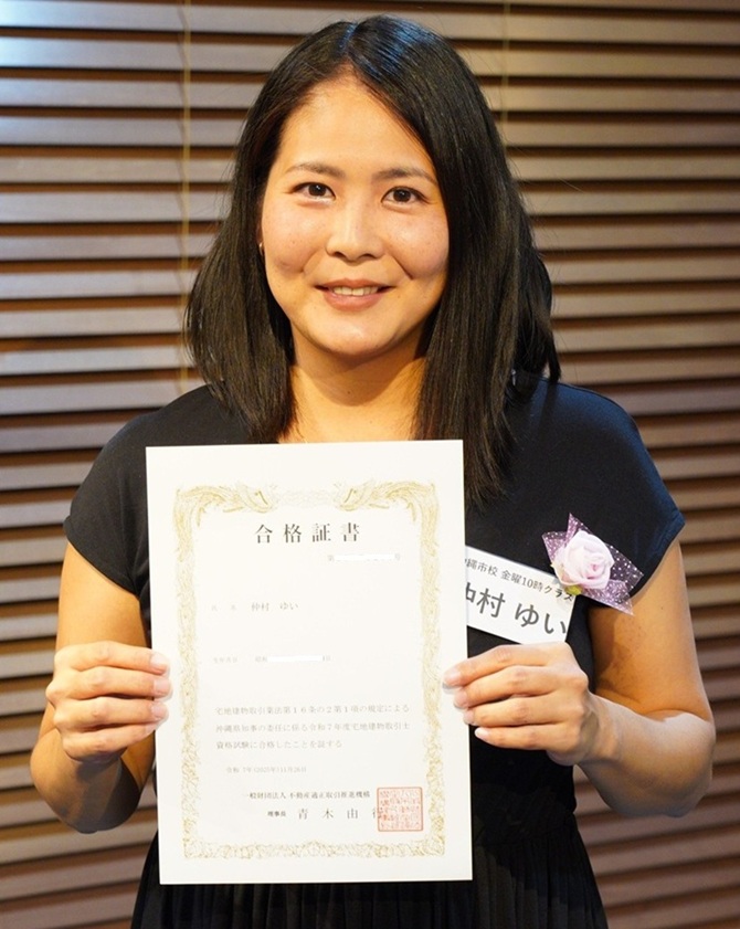 仕事と4歳の子供の育児の両立ができるように、ネット講座がいつでも受けれて、週1回は講師に直接質問ができる学校を探していたところ沖縄宅建スクールを見つけました。ちょうど沖縄市でも講座を開設してくれるということでここしか無いと即決しました。